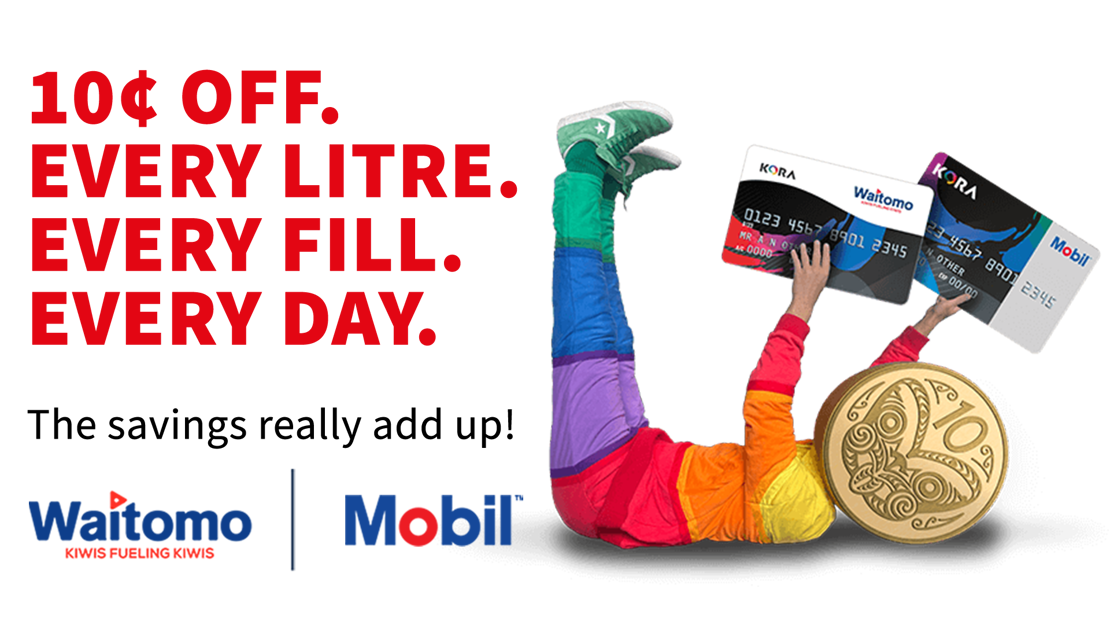 You can use your Kora cards to fill up and pay at Waitomo and Mobil stations. There are more than 350 sites all round New Zealand, so wherever you go with Kora, the savings will follow.